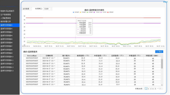 根据采集到的数据,系统还可以统计并生成温湿度曲线图、翻曲时间对比图、设备信息报表等图表,通过电子大看板直观反映生产现 场情况,让管理者一目了然,实现数字化、可视化生产,有助于推进后期的标准化生产。