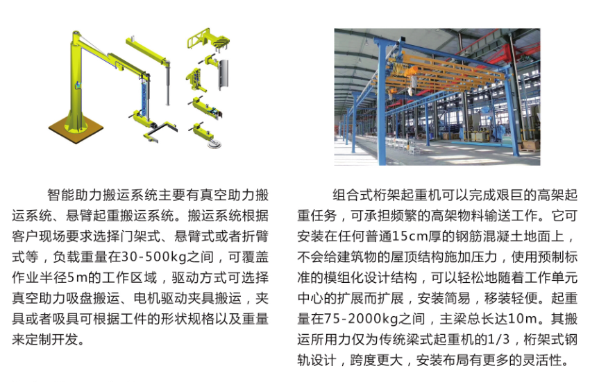 人机物流搬运系统主要有组合桁架起重系统、智能助力搬运系统,可实现对较大工件的快速搬运、流畅移动和准确定位。