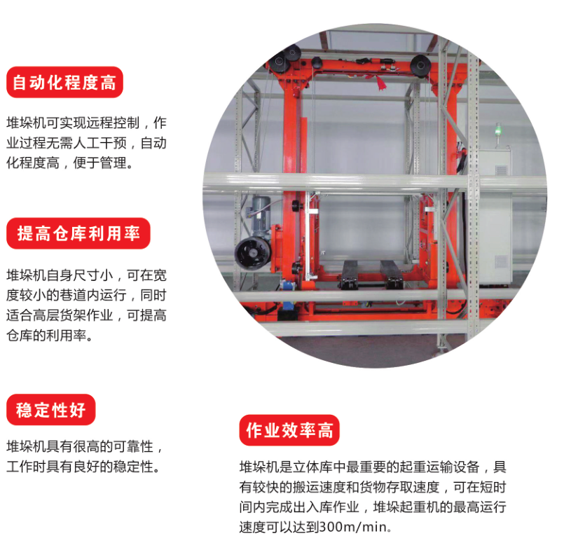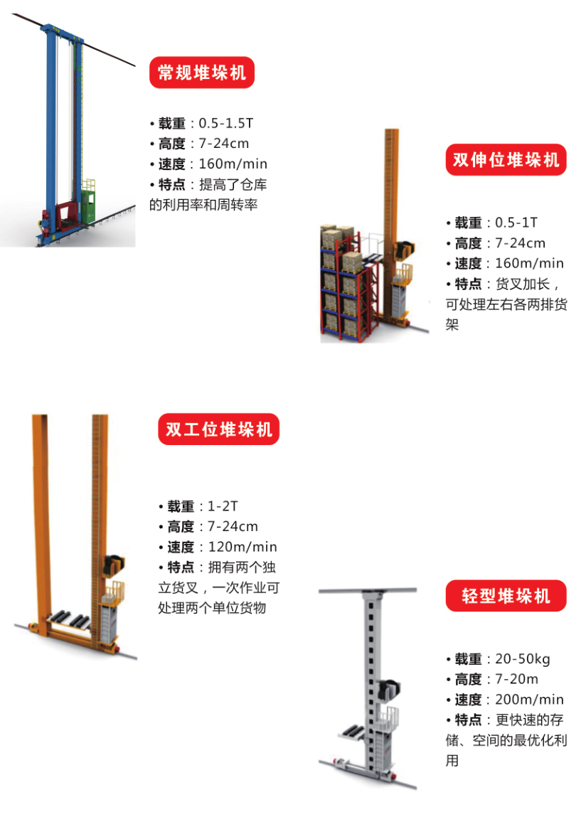 堆垛机是自动化立体仓库的核心设备,其主要用途是在高层货架的巷道内沿轨道 来回穿梭运行,将位于巷道口的货物存入货格;或者取出货格内的货物到巷道口 ,完成出入库作业。堆垛机结构稳定可靠,由矢量变驱动和编码控制位置,采用机 械和电气双重保险装置,确保安全,采用信息传递全程跟踪技术,电气元件均采用进 口产品,触摸屏界面操作简单、实现手动、单机自动和联机自动控制,与多种物流设 备组合形成完整的物流系统。