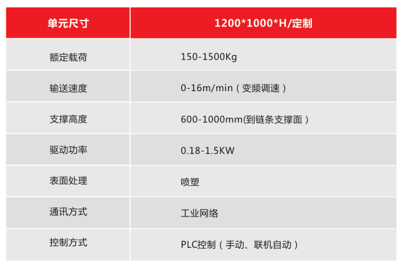 链式输送机是以链条作为牵引和承载体输送物料,链条可以采用普通的单或双排套筒滚子链, 也可采用其他特种链条。链条支撑在导轨上并沿导轨运动。链条的运动是驱动装置通过传动链 和链轮带动,带货物的托盘就随着链条的移动而运动。驱动装置选用国内外知名品牌电机减速 机,运行可靠,故障率低。输送机俩侧装有保护导向装置。